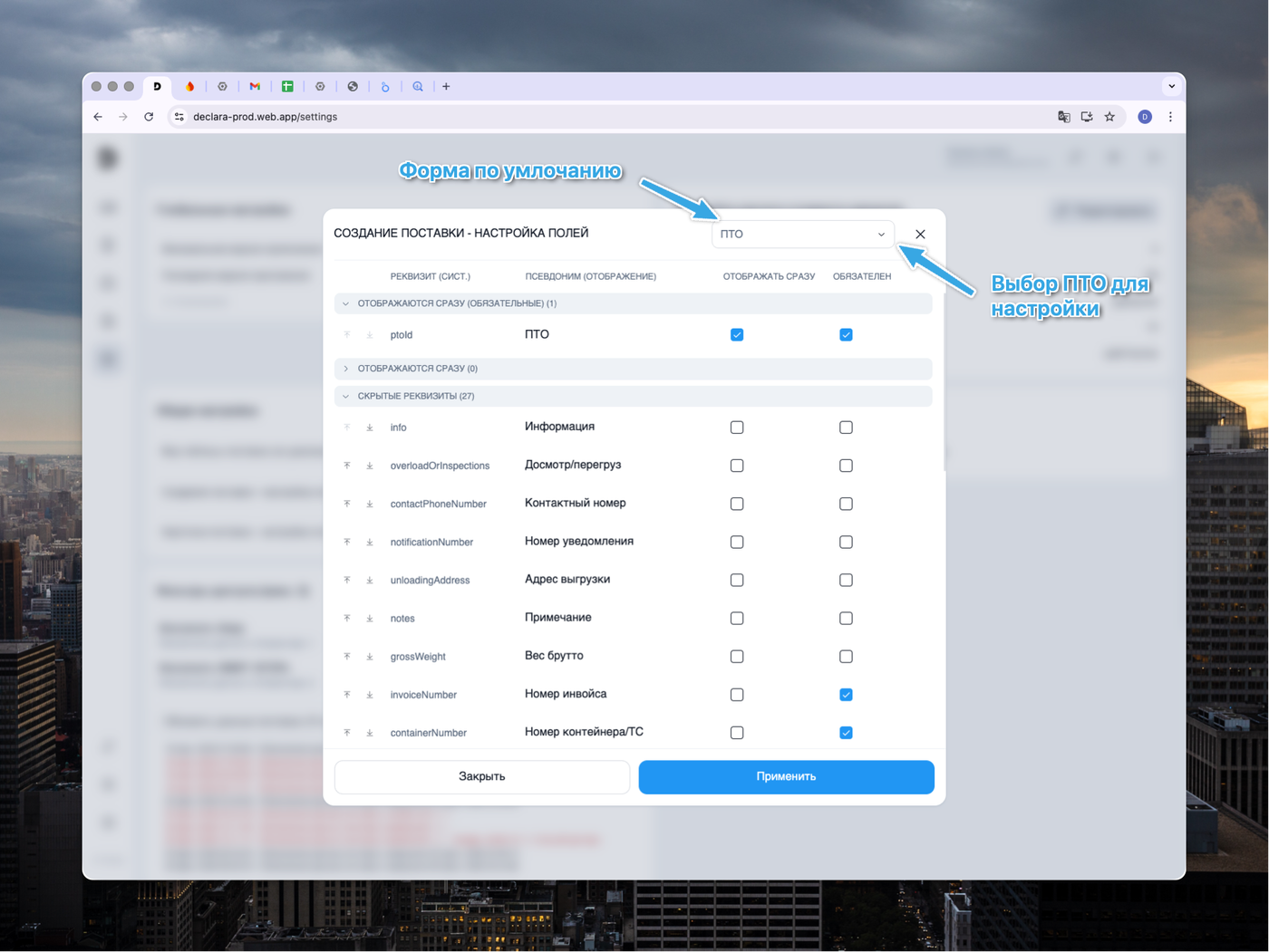 Добавлен конфигуратор полей формы создания поставки. Состав, видимость и обязательность реквизитов теперь автоматически меняются в зависимости от выбранного ПТО (реализованы отдельные сценарии для ПТО Колядичи и остальных пунктов). По каждому ПТО возможна индивидуальные параметры (в настройках). Доступно для администраторов.