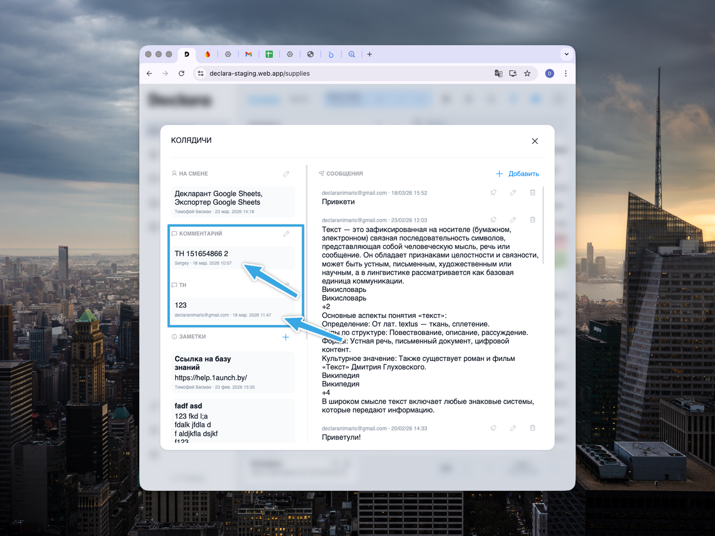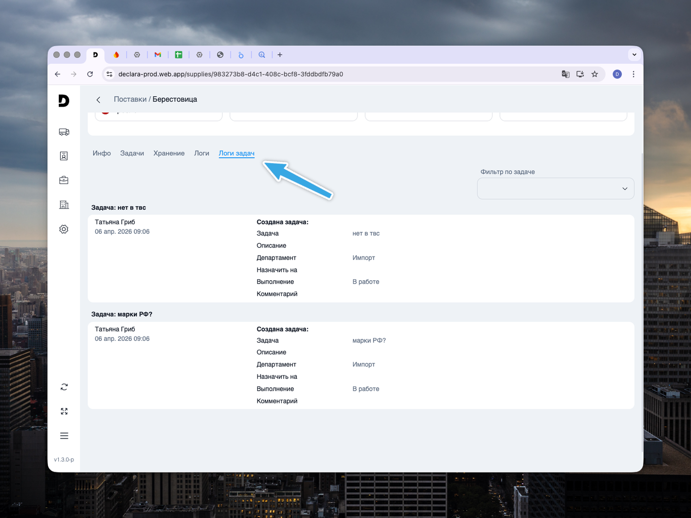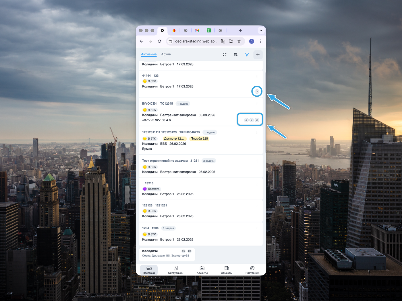 На карточках поставок добавлен визуальный индикатор назначенных исполнителей в виде букв (э - экспорт, д - декларант, и - импорт). Индикатор отображается, если указан такой ответственный по этой поставке.