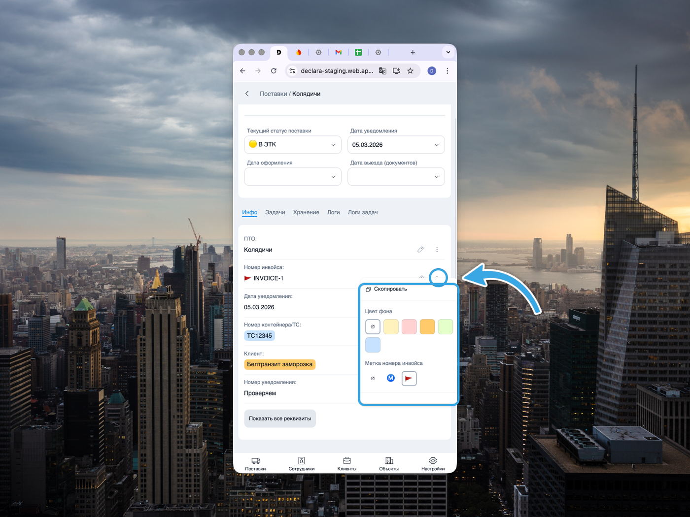 Внутри карточки поставки с мобильных устройств поставки теперь доступен функционал меню (можно выбрать/сменить/убрать цвет для реквизита, указать метку для инвойса и тд).