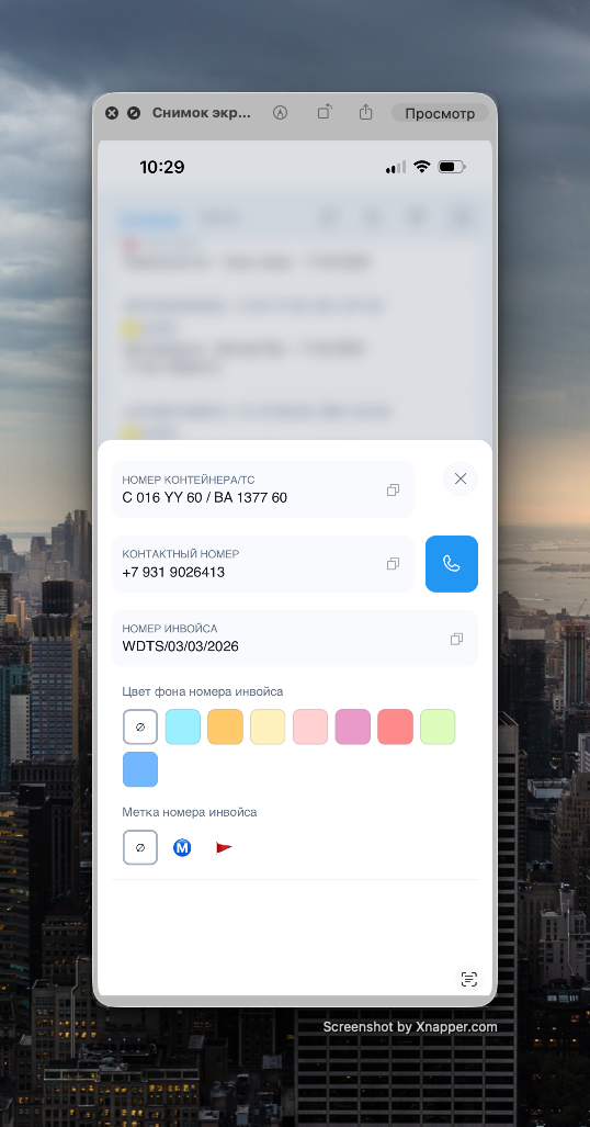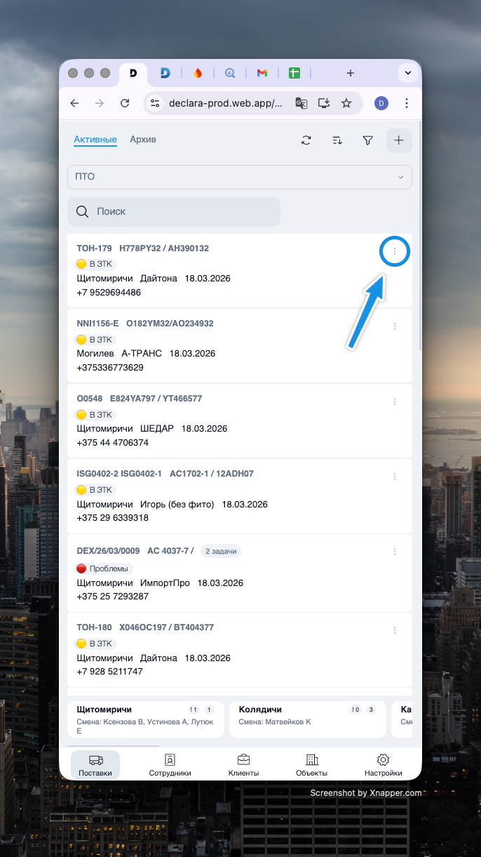 Мобильное меню (NIM-140): Добавлено всплывающее меню (по кнопке "...") в мобильной версии для быстрого копирования номеров контейнера/ТС/инвойса/телефона и покраски реквизитов.