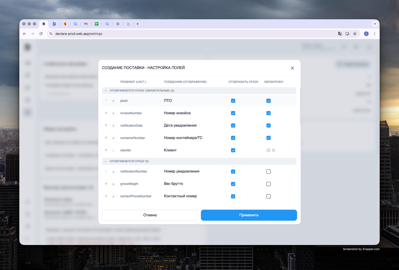 Настройка реквизитов (NIM-125): Реализован интерфейс для управления составом, порядком и видимостью полей при создании и просмотре поставки. Добавлена кнопка "Показать все реквизиты" для скрытых по умолчанию полей.