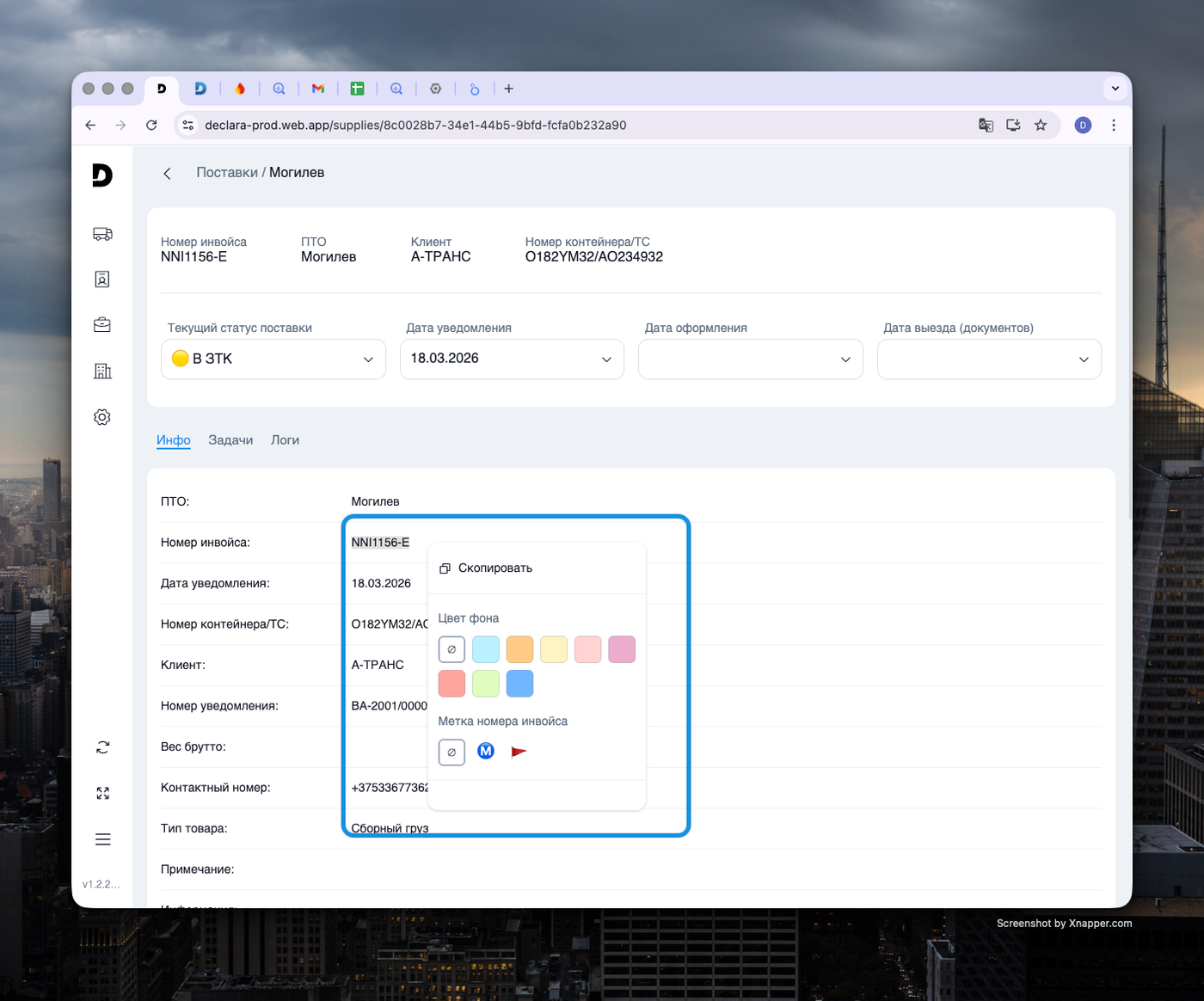 ПКМ-меню в карточке (NIM-144): Появилась возможность менять цвет фона ячеек и ставить метки инвойсов прямо внутри карточки поставки через правый клик.