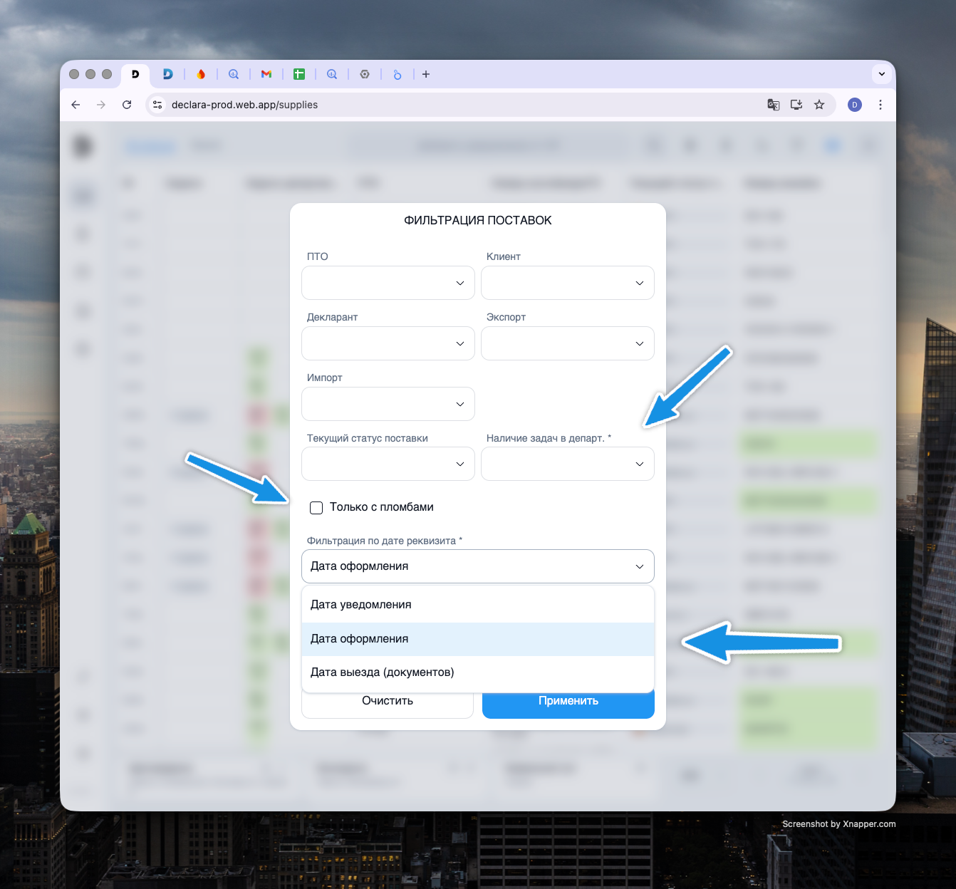 Новый фильтр (NIM-149): Добавлена возможность фильтрации поставок по "Дате оформления". Также доступны фильтры по задачам и для выбора строк с пломбами.