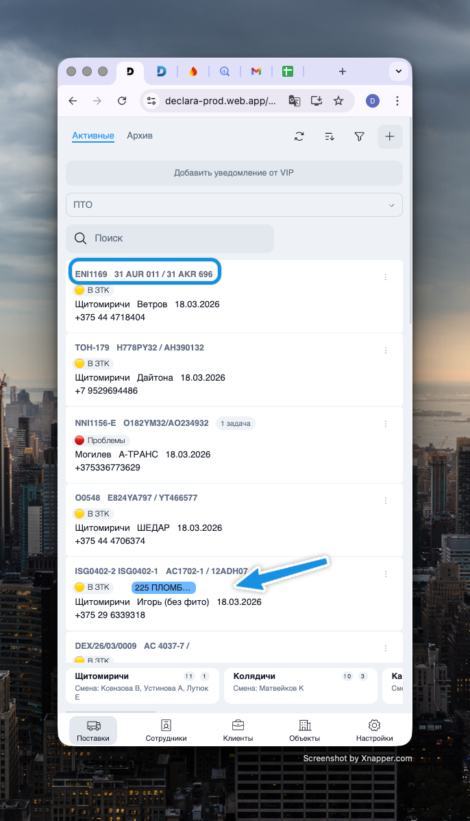 Компактный вид (NIM-126): Карточка поставки на мобильных устройствах стала компактнее. Номера инвойса и ТС выделены жирным. Значения "Досмотр" и "Пломба" выводятся в цветных плашках (первые 10 символов), если они залиты цветом в системе.
