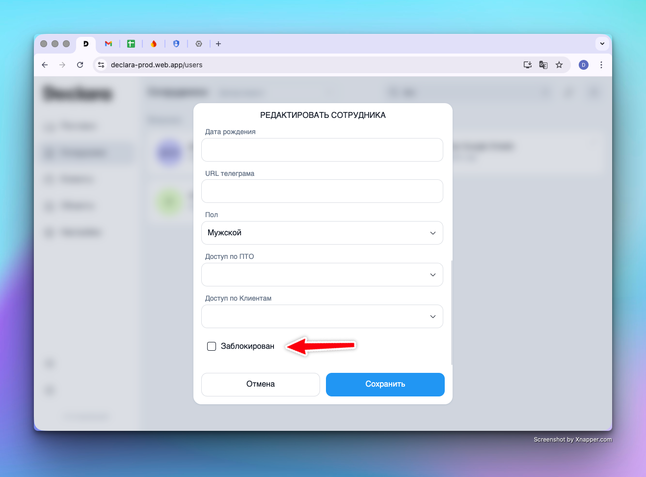 Найдите пункт «Заблокирован» и отметьте его чекбоксом.