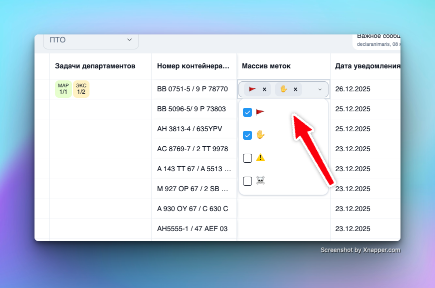 Рекомендация: Хотя в качестве тэга можно использовать любой текст, мы рекомендуем использовать эмодзи (🚩, ⚠️, ✅, 📦). Это значительно повышает наглядность таблицы и позволяет мгновенно «считывать» состояние поставки даже при беглом просмотре.
