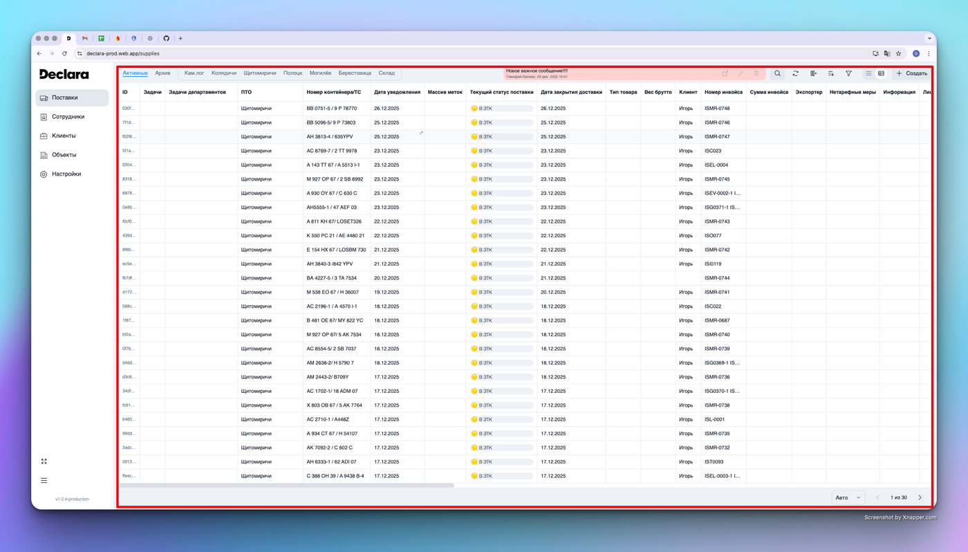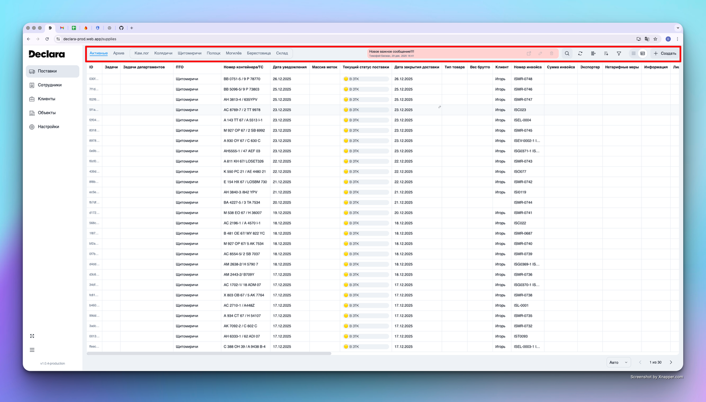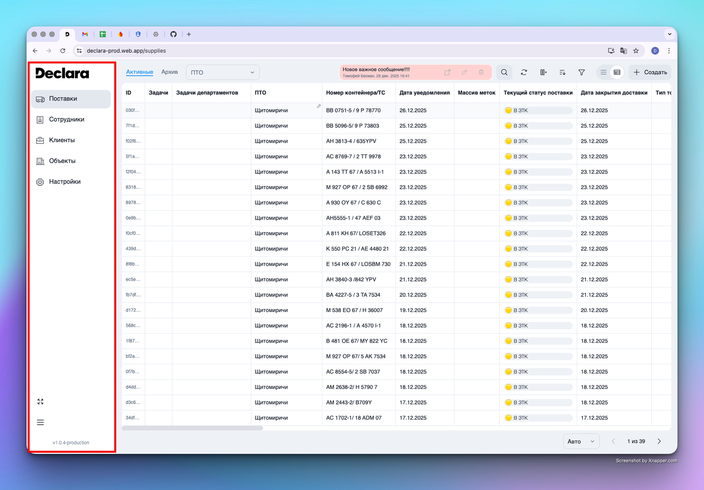 Заголовки столбцов: Позволяют видеть все детали поставки: ID, номера контейнеров, даты уведомлений, текущий статус (например, «ВЗТК») и финансовые параметры.