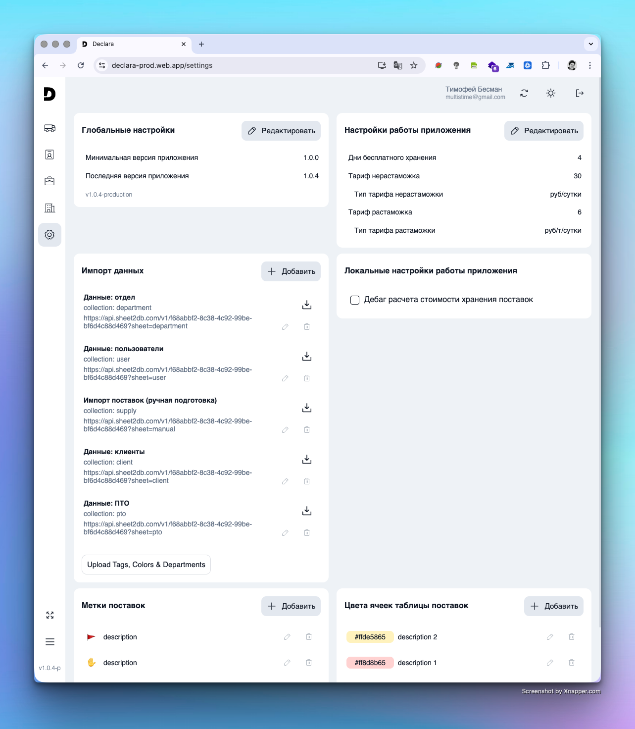 Локальные настройки: включают режим «Дебаг расчета стоимости хранения», который используется для проверки корректности работы алгоритмов расчёта стоиомости хранения.