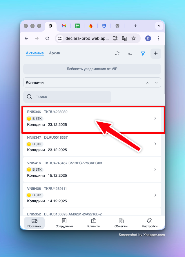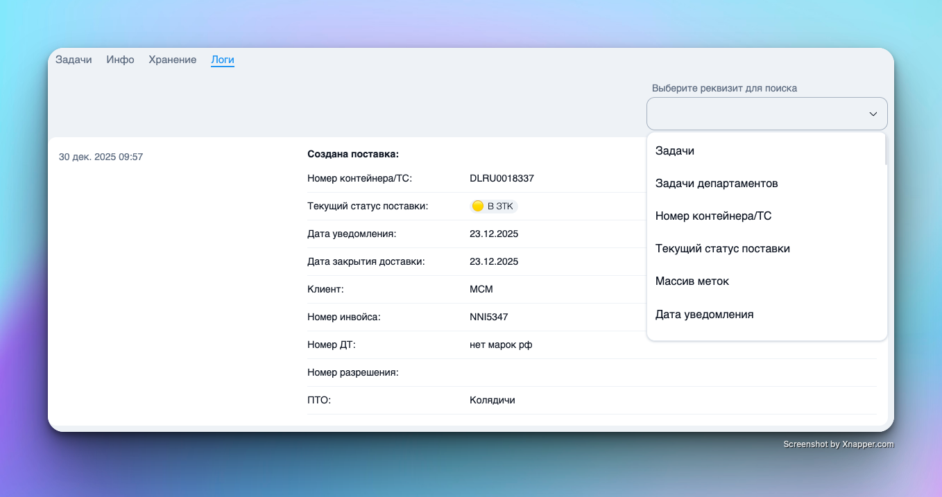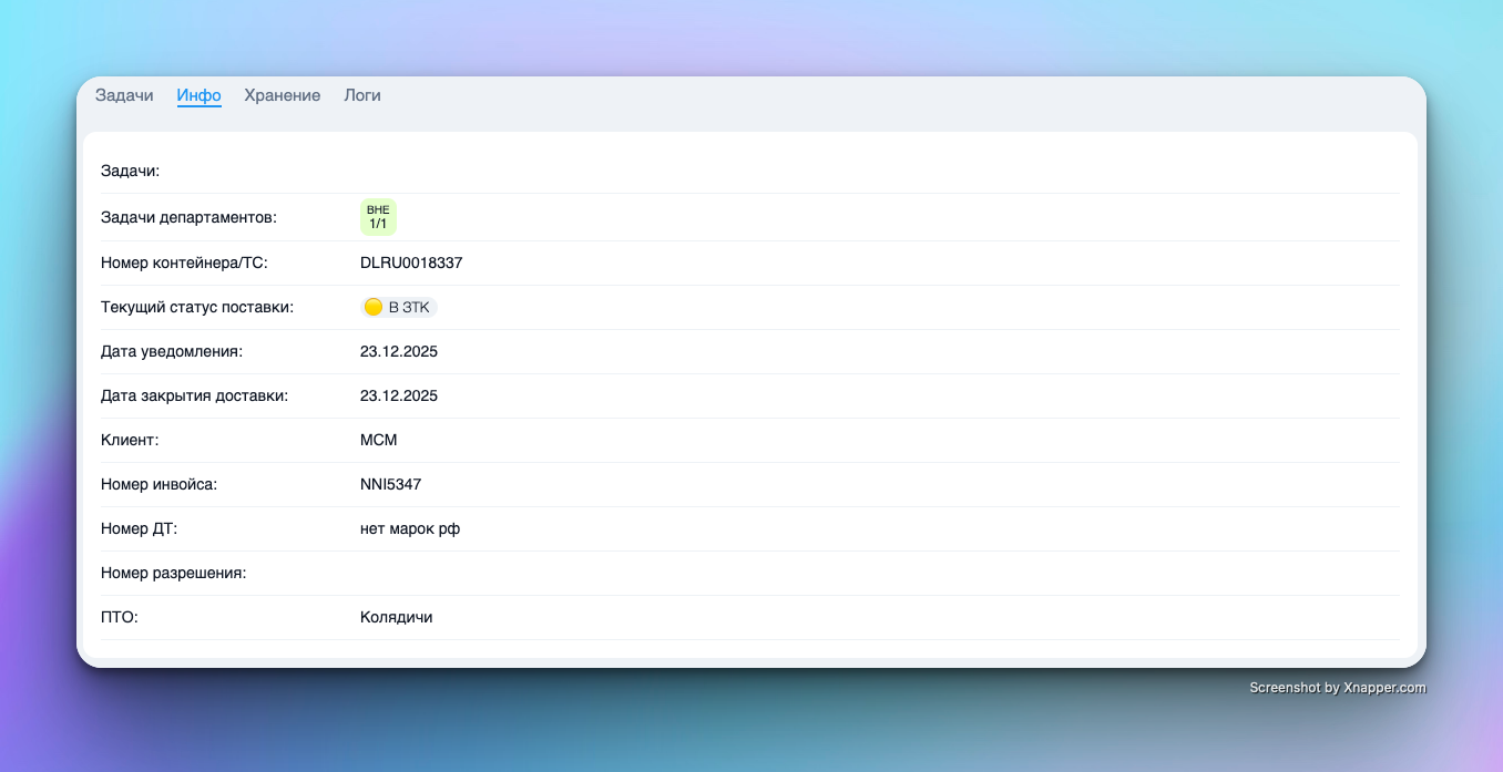 В верхней части экрана всегда отображаются ключевые реквизиты поставки: текущий статус, метки, основные номера (инвойс/контейнер), клиент и даты уведомления/закрытия.