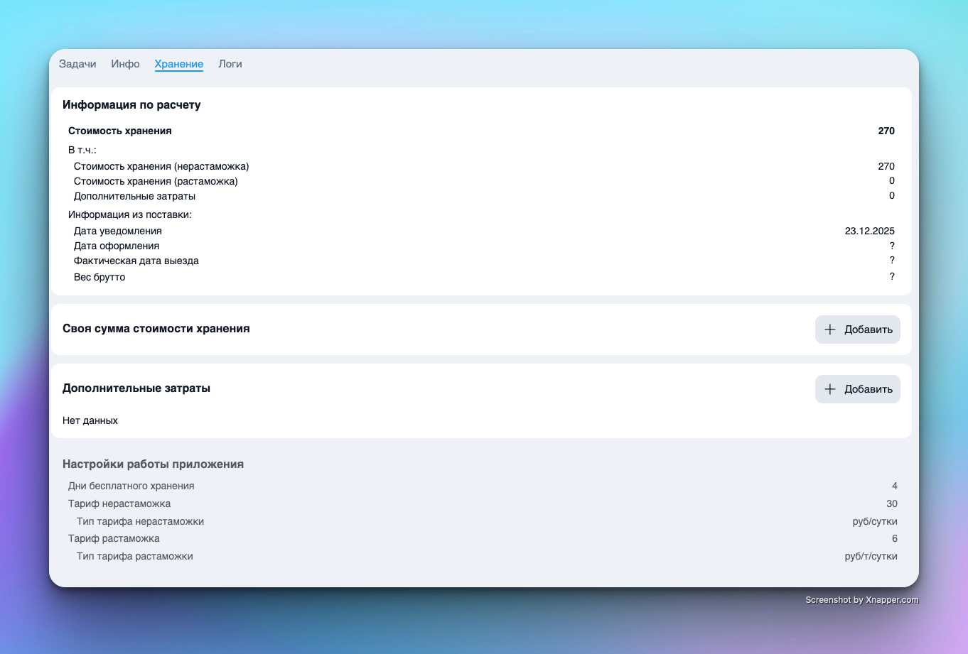Содержит расчетную информацию о стоимости хранения груза на ПТО.