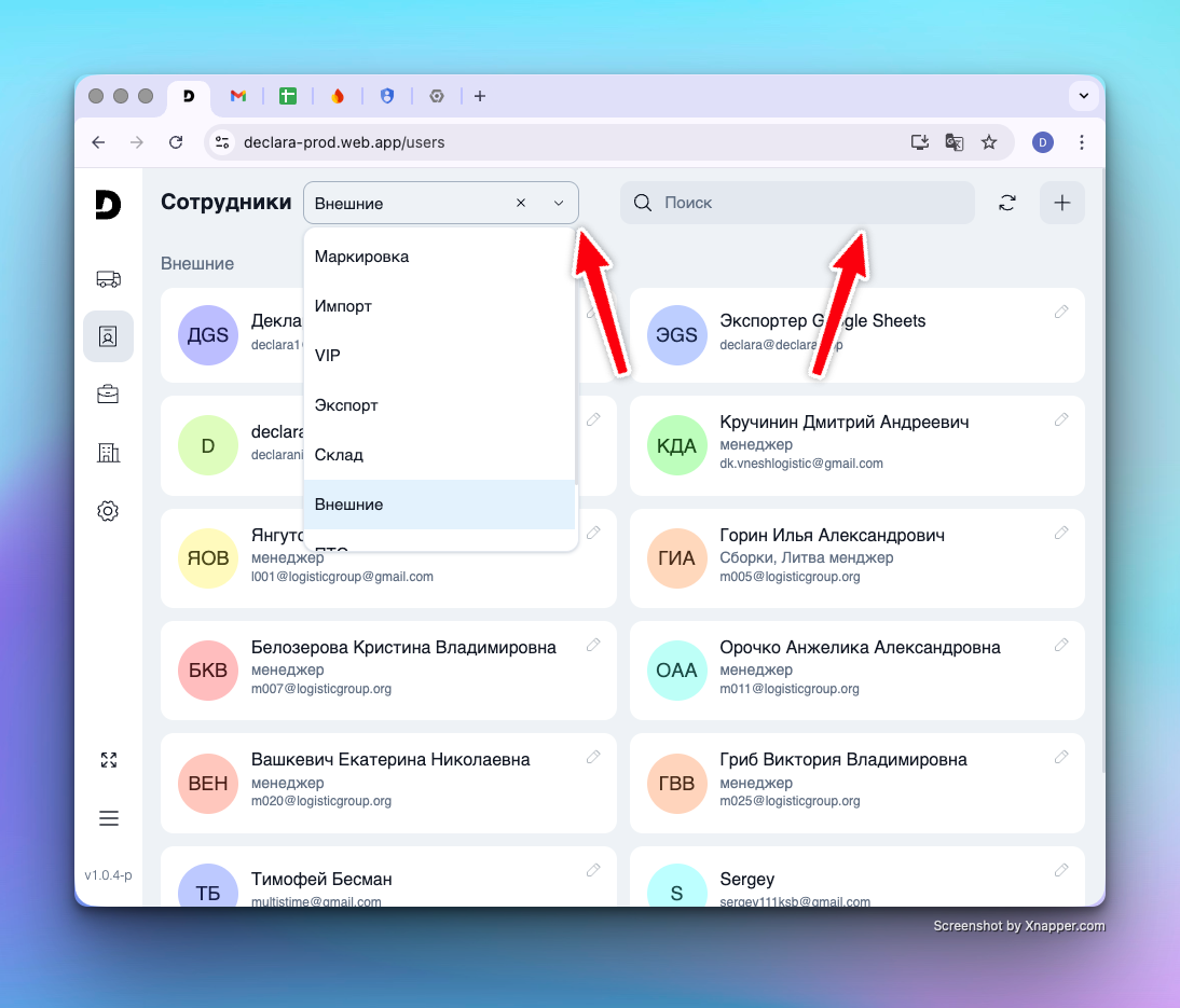 Фильтр по отделам: Позволяет сегментировать список и отобразить только сотрудников конкретного департамента (например, «Отдел импорта» или «Бухгалтерия»). Это особенно удобно при постановке задач, когда нужно найти ответственного из определенной структуры.