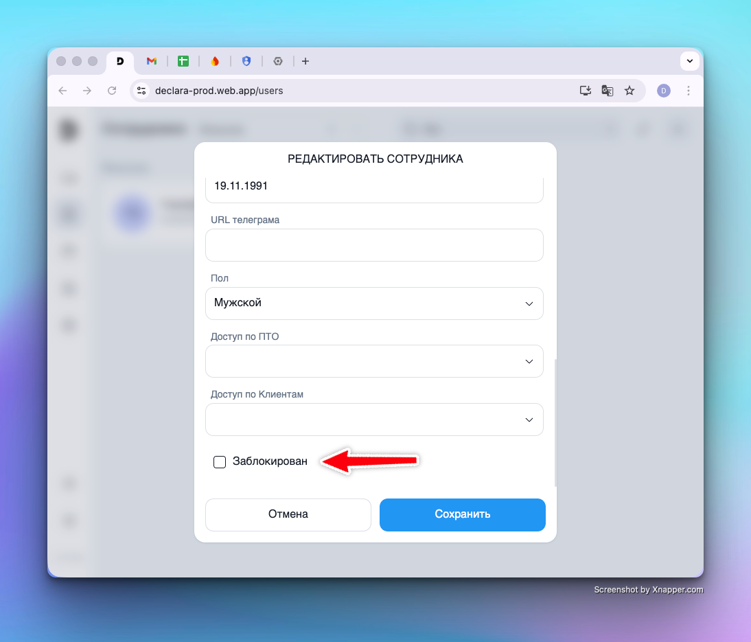 Как это работает: В карточке или в строке списка предусмотрен чек-бокс блокировки. При переводе сотрудника в статус «Заблокирован» его доступ к приложению мгновенно прекращается.